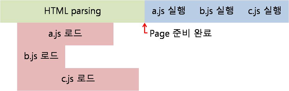브라우저가 html 파일을 위에서부터 차례로 읽어내려가다가 <script>를 만나면 HTML parsing을 멈추고 서버에서 자바스크립트 파일을 다운로드 하기 시작한다. js 파일 다운로드가 끝나면 js를 실행하고, 그 뒤에 잠시 멈춰두었던 HTML parsing을 다시 시작한다. 이 방식은 js 파일의 크기가 너무 크거나 네트워크가 느리면 사용자가 완전한 웹사이트를 보는 데까지 시간이 오래 걸린다.