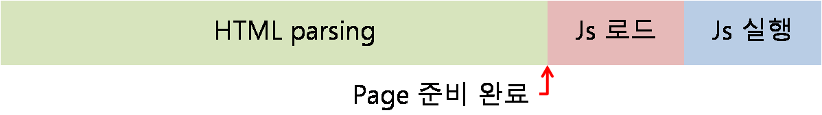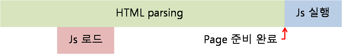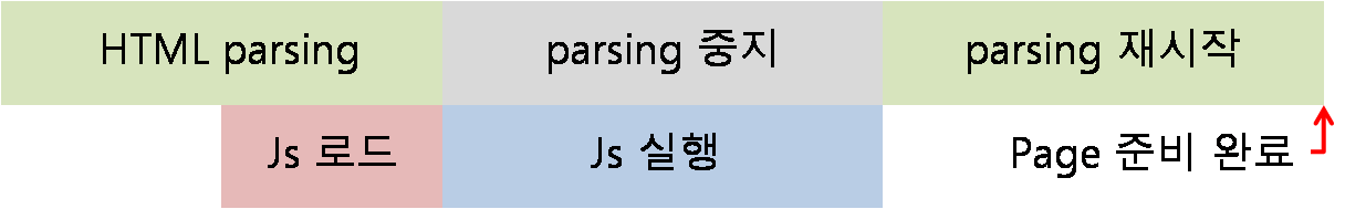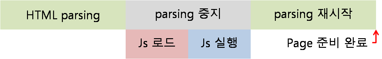 하지만, HTML parsing이 완료되기 전에 js가 실행되므로 js에 아직 생성되지 않은 DOM요소를 참조하는 코드가 있다면 오류의 위험성이 있으며 js를 실행하기 위해 중간에 HTML parsing을 중지하므로 사용자가 완전한 페이지를 보는데 시간이 걸린다.